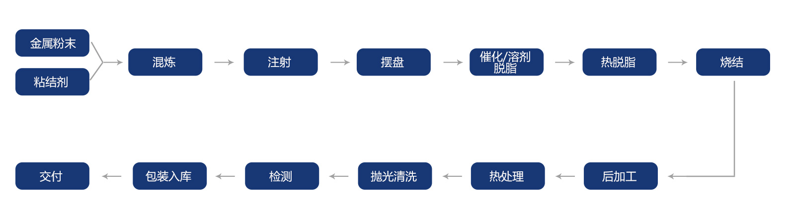 首先,選取符合MIM要求的金屬粉末與有機(jī)粘結(jié)劑,在一定溫度條件下,采用適當(dāng)?shù)姆椒ɑ旌铣删鶆虻奈沽?,然后,?jīng)制粒后在加熱塑化狀態(tài)下,用注射成形機(jī)注入模具型腔內(nèi)獲得成形坯,再經(jīng)過化學(xué)或溶劑萃取的方法脫脂處理,最后經(jīng)燒結(jié)致密化得到最終產(chǎn)品。